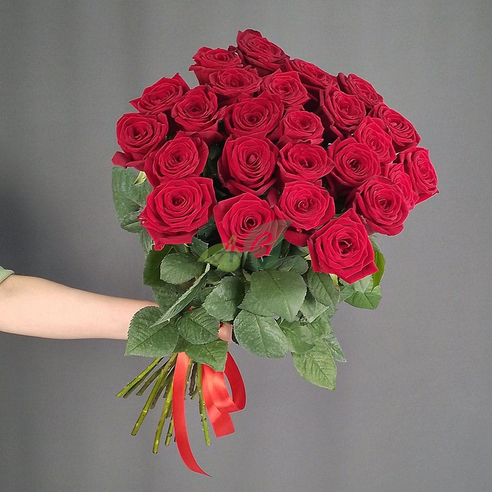 • Роза - 25 штук, цвет - красный, длина стебля - 60 см;